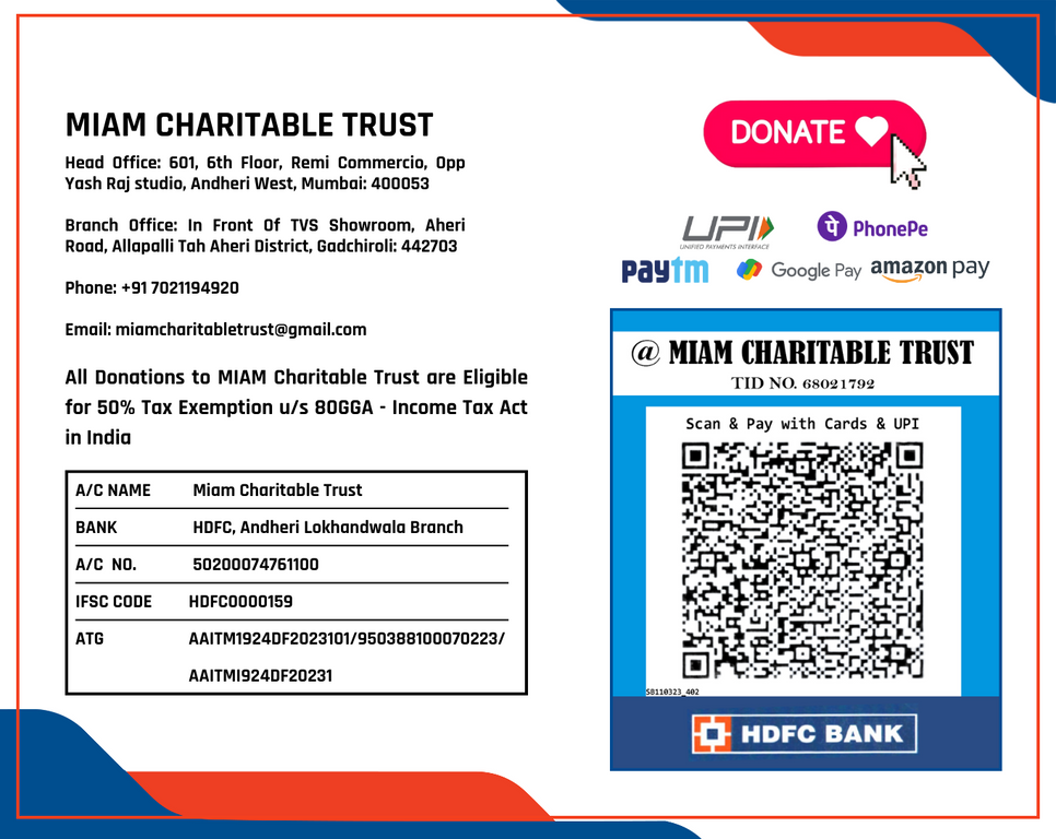 Your donation to MIAM Charitable Trust serves as a powerful gesture of compassion and commitment to fostering humanity, culture, and values. Your support directly contributes to shaping a better world, empowering the younger generation, and preserving our rich cultural heritage.